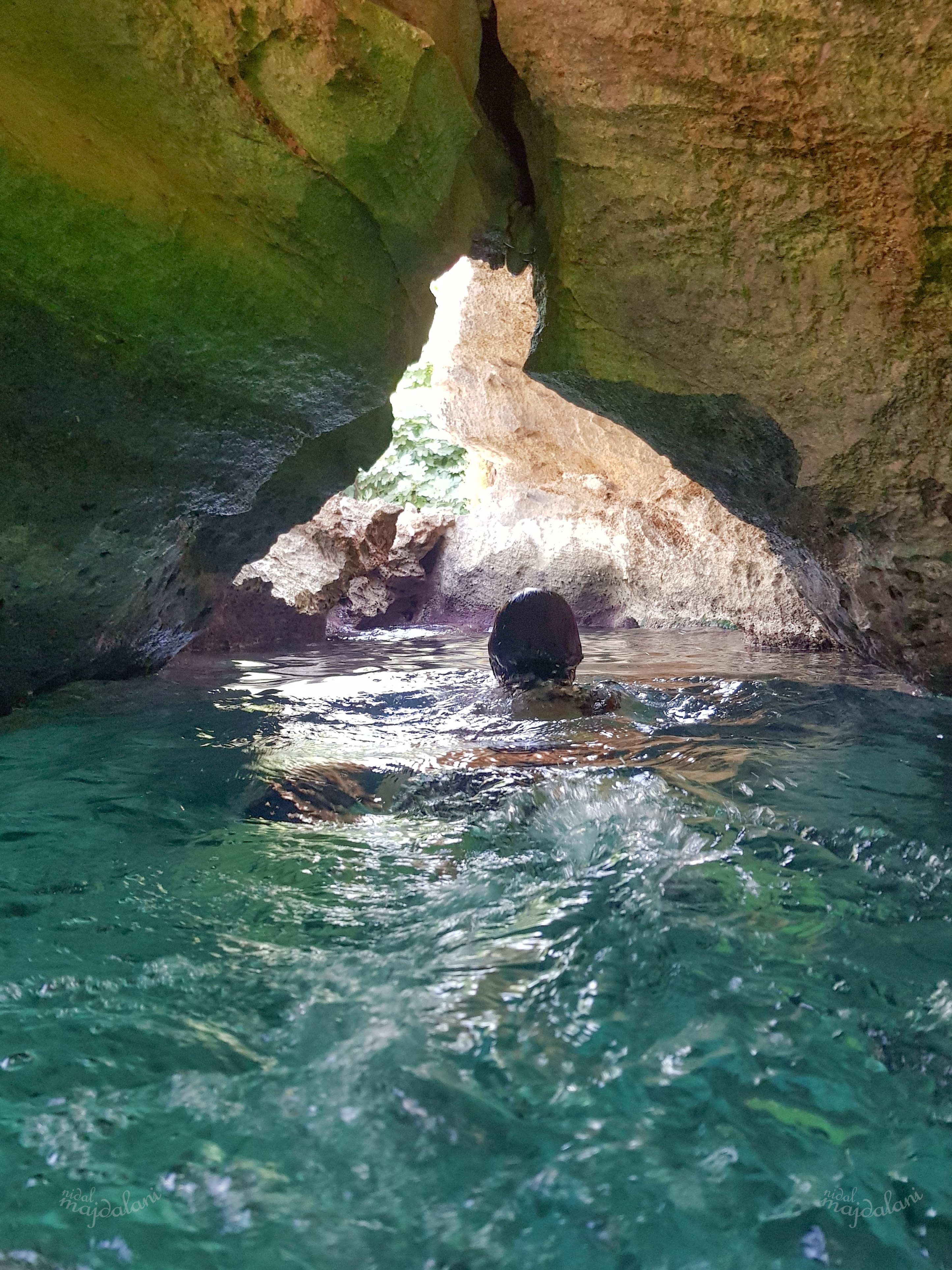 ركنتُ سيارتي قرب "جوينينغ بيتش-Joining Beach"، نقطة انطلاق مفضلة لمن يعشقون المغامرة، من متسلقي الصخور في البحر إلى من يتركون صخب المدن بحثاً عن الصفاء. سرتُ نحو المسار الجانبي، ومن الأفضل ارتداء حذاء مائي للمشي على الصخور الملساء والطحالب الزلقة بسهولة، وصولاً إلى حافة صخرية تنزلق منها إلى البحر. سبحت وانعطفت نحو اليسار حيث تنخفض حرارة المياه قليلاً، فالتقطت أنفاسي وغصت تحت الماء أسفل الصخور أفتش عن مصدر ضوء الشمس، الدليل الأنسب إلى الداخل، إلى مغارة نصف مغمورة بالماء. في الداخل، امتزج الضوء وانعكاساته على المياه والصخور، وكانت التجربة أقرب إلى لحظة بين الحلم والواقع. أشعة الشمس تتسلّل من الأعلى، ترسم خطوطاً ذهبية عبر الماء الفيروزي. الجدران الصخرية مخططة تتلوّن بالزمرد والأزرق، والأسماك الصغيرة تسبح في أسرابٍ شفافة، تنسج بين الضوء والماء عالماً من السكون النابض بالحياة.